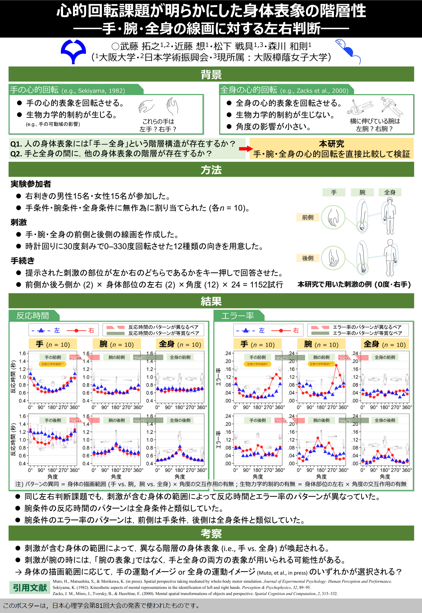 日本心理学会第81回大会にて,「心的回転課題が明らかにした身体表象の階層性――手・腕・全身の線画に対する左右判断――」という演題でポスター発表を行いました。発表で使用したポスター